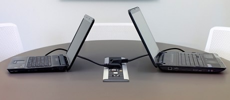 A similar module which is more discreet uses the cable grommet concept but with a lift-up unit in a type of tower format. This format works well where a table has a deep base / leg to contain the pop-up unit when closed.